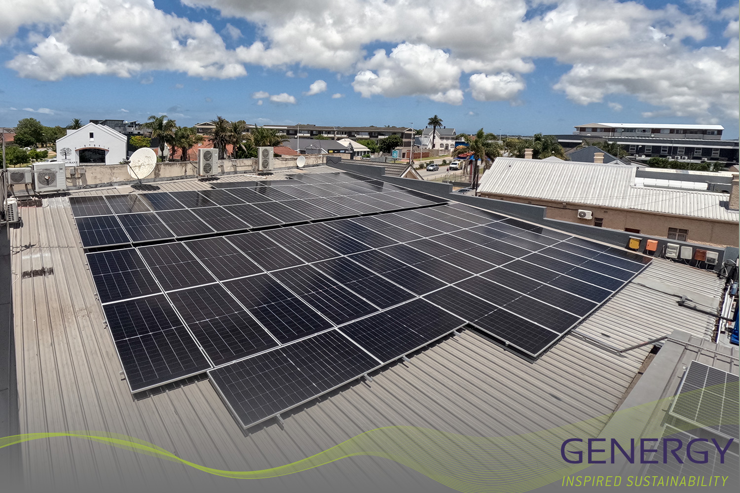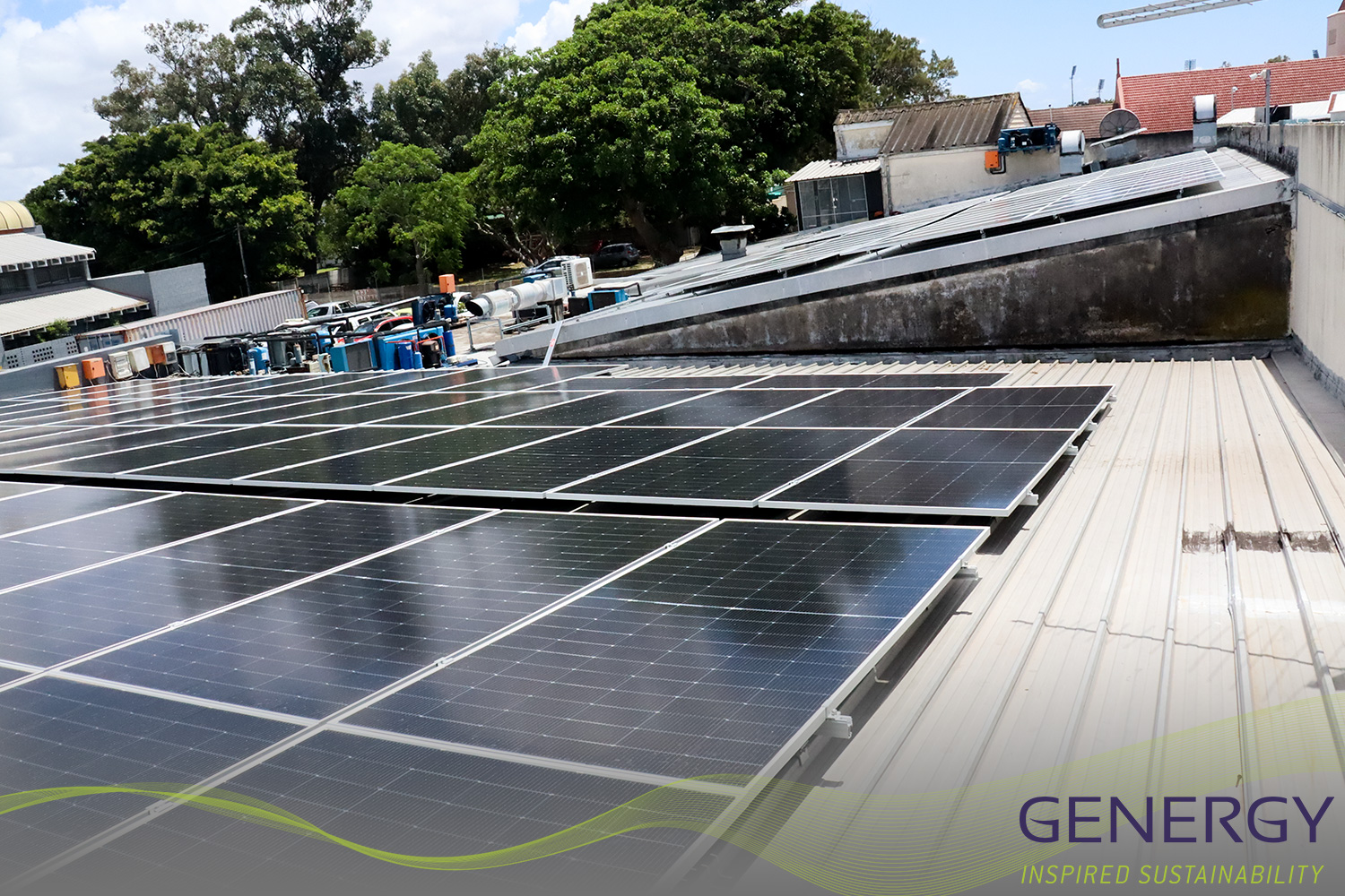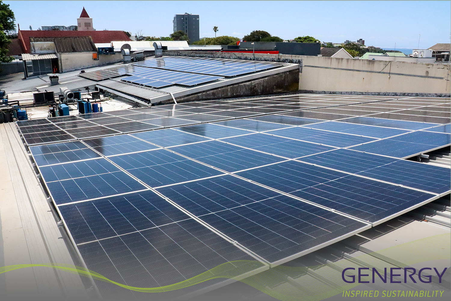 solar panels on rooftop with green lines logo at bottom of the image and writing in bottom right corner: GENERGY, Inspired sustainability