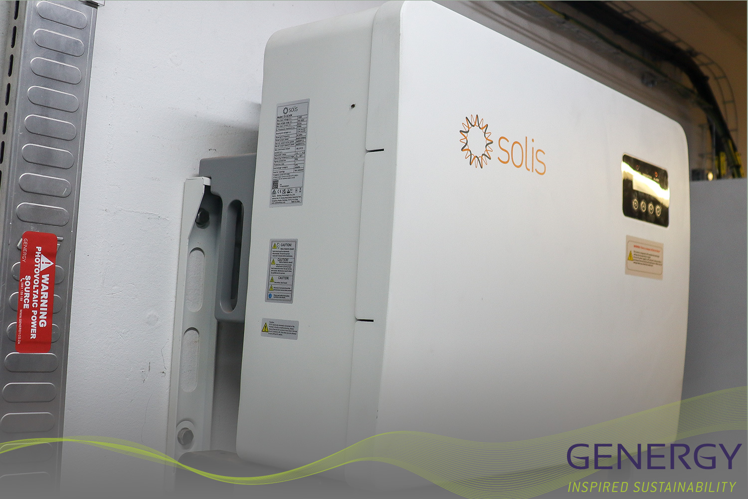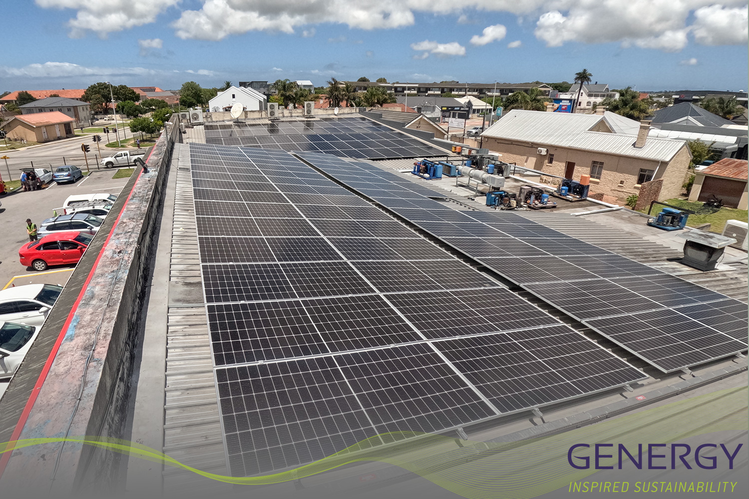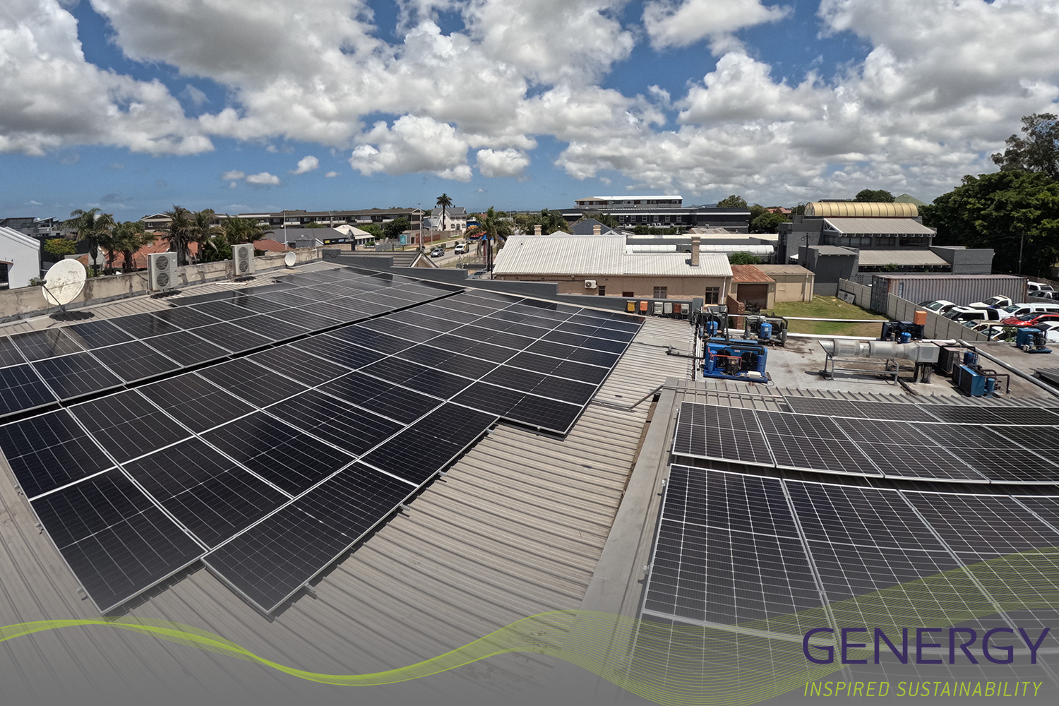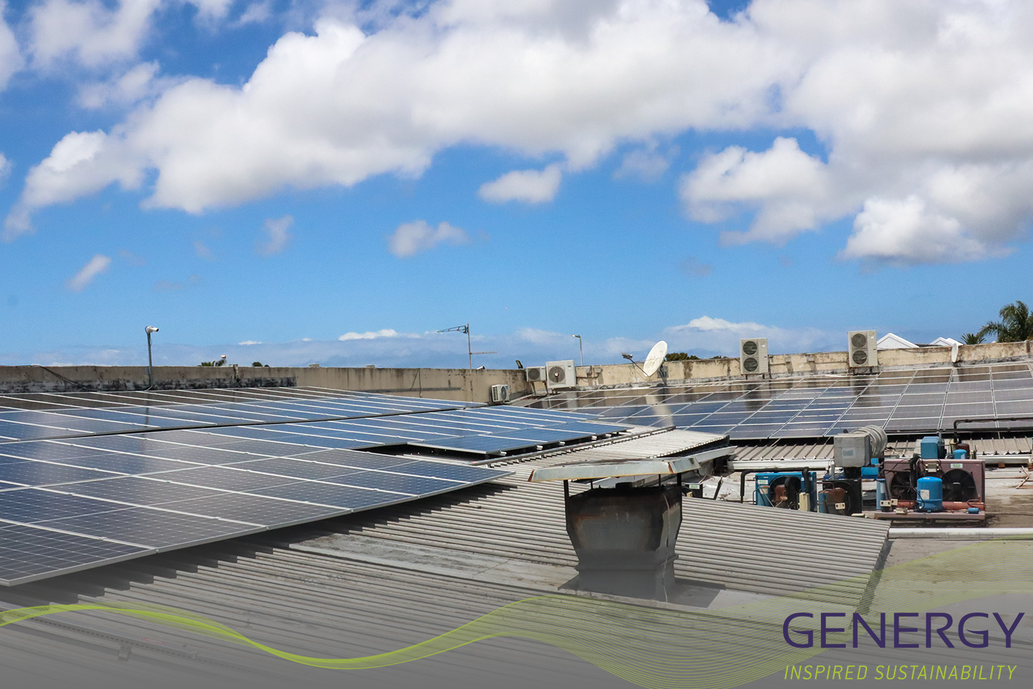 solar panels on rooftop with green lines logo at bottom of the image and writing in bottom right corner: GENERGY, Inspired sustainability